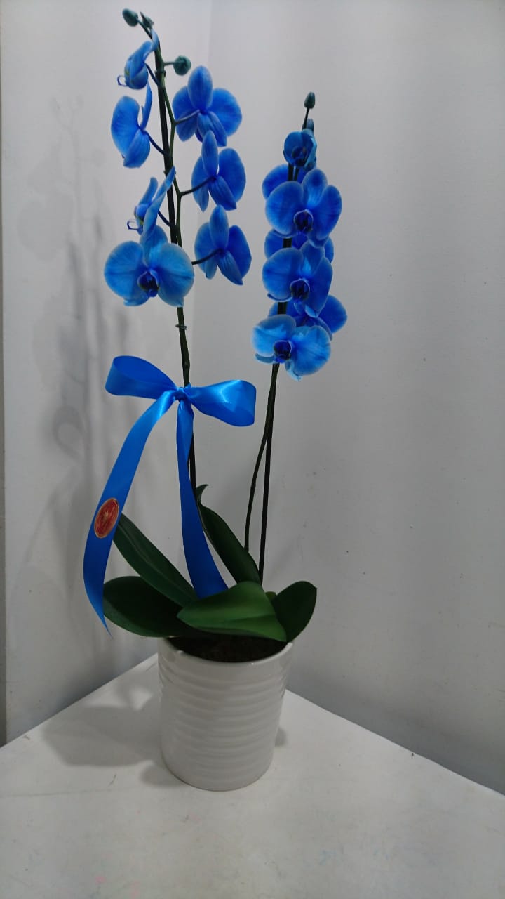 Orquidea tinturada de azul com 2 hastes no cachepot de ceramica brilhante